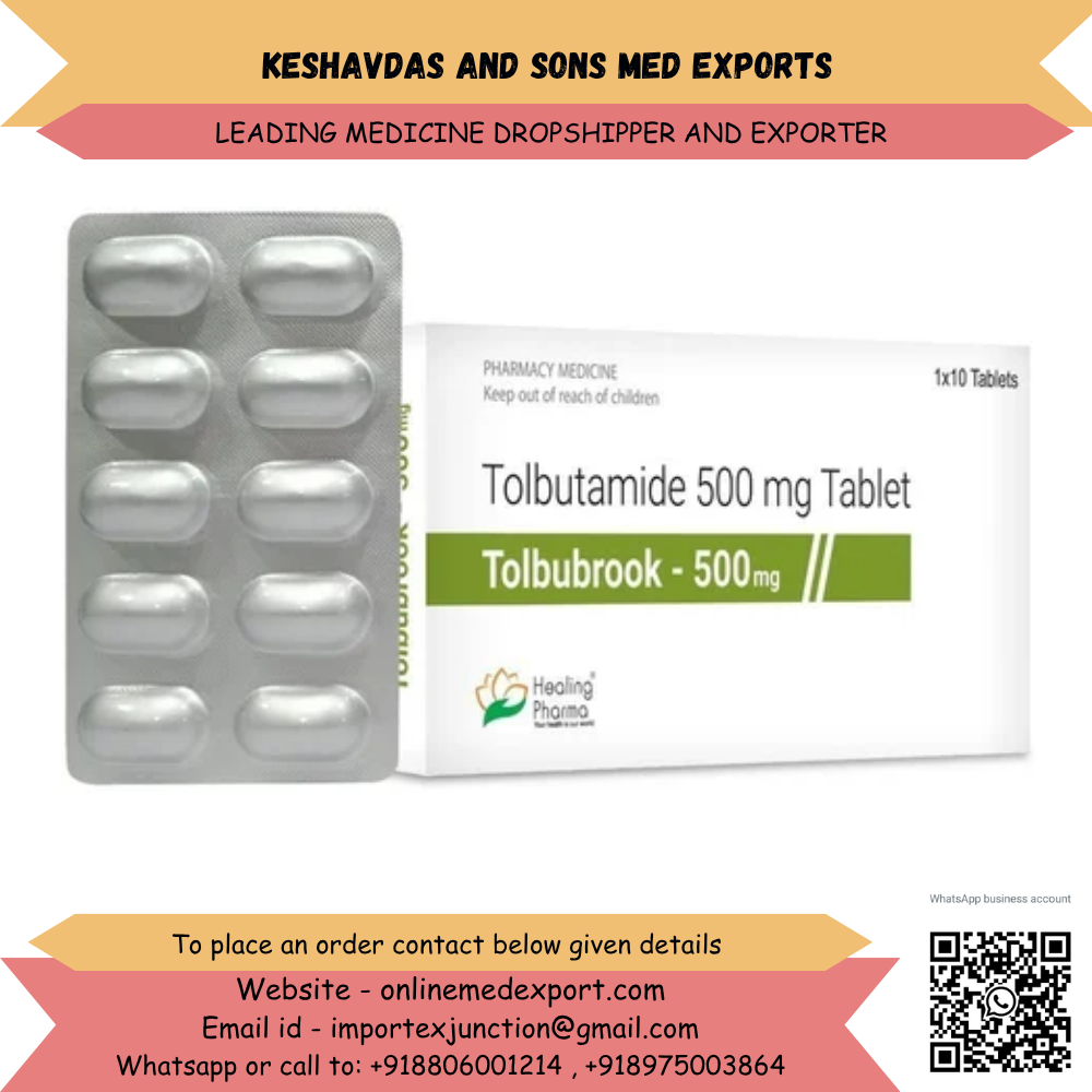 Tolbutamide 500 mg is a sulfonylurea class medication, prescribed under medical supervision for managing type 2 diabetes and blood sugar levels. At Keshavdas and Sons Med Exports, we focus on quality assurance, proper storage, and safe international shipping to ensure medicines reach customers securely.